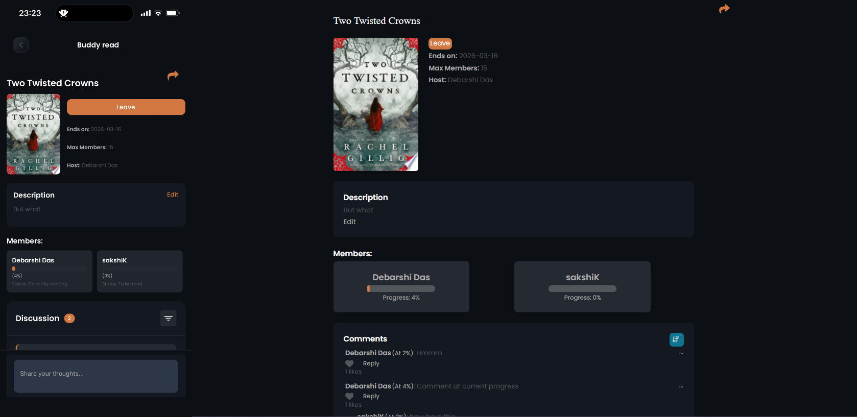 6. Track Progress: Keep an eye on your reading progress and see how far along your buddies are. Buddy Reads allows you to track the group’s pace and stay engaged as you move through the book together.