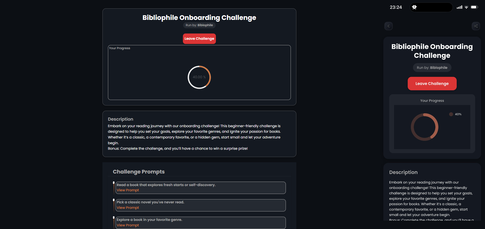 Kickstart your reading journey with the Onboarding Challenge! This challenge is designed to introduce you to the app’s features and get you started on your reading adventure. Complete different prompts, such as reading a certain number of pages, to earn rewards.