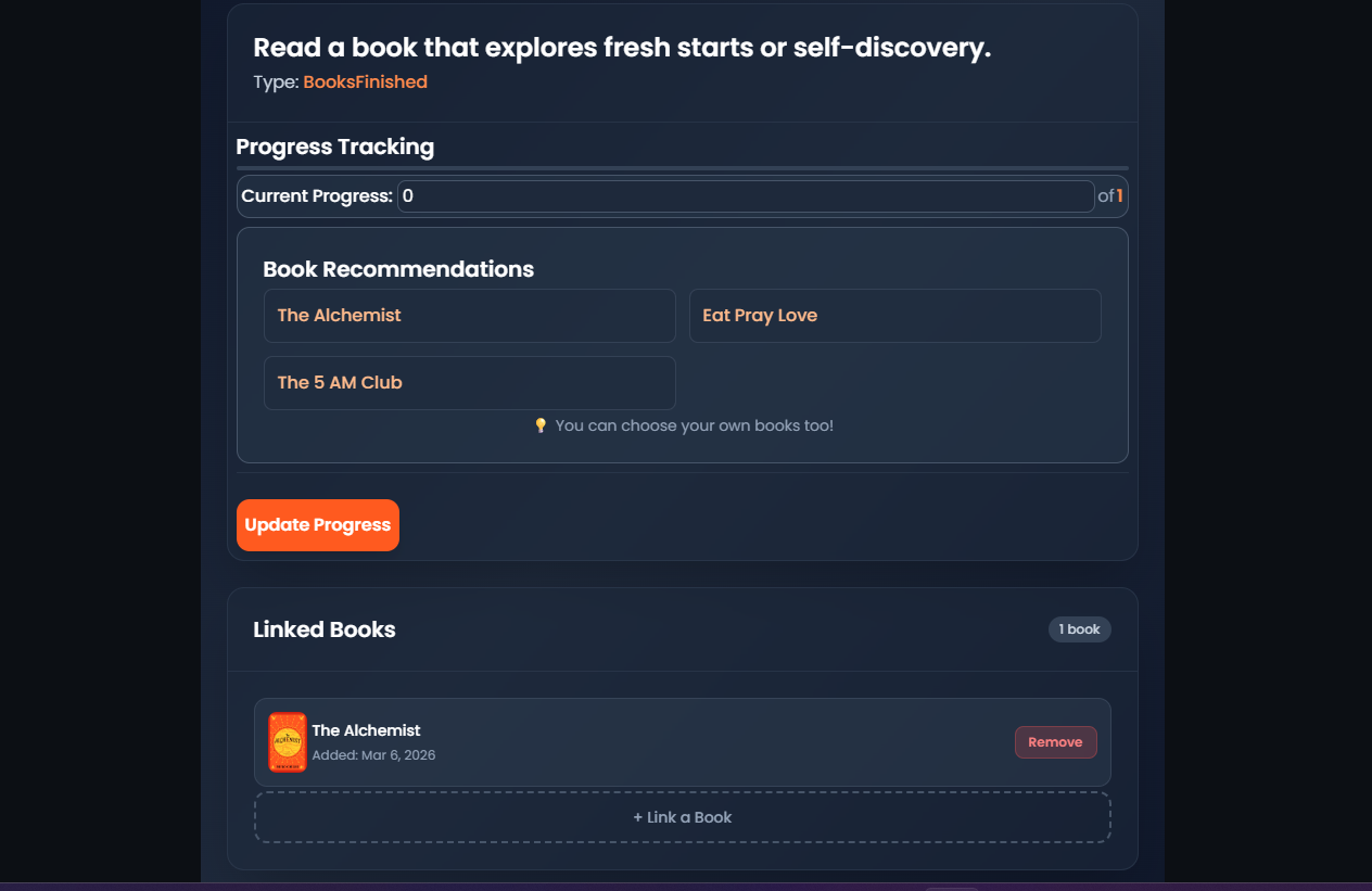 - Track Your Progress: As you read, manually update your progress by marking the pages read or books completed. You can track how far you’ve come and see your progress displayed in your challenge dashboard.